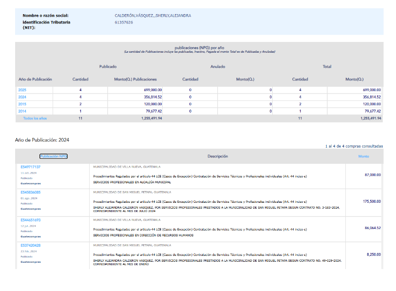 En 2025, Sherly Alejandra Calderón Vásquez ha acumulado más de Q699,000 a través de contratos simultáneos en los municipios de Villa Nueva y San Miguel Petapa, gobernados respectivamente por Mynor Morales Zurita y Mynor Morales Chávez. Según los registros oficiales de Guatecompras, estos ingresos incluyen dietas, bonos y un salario universitario, sumando más de un millón de quetzales entre 2024 y 2025. La magnitud de estos pagos ha encendido alertas sobre la transparencia en la administración de recursos públicos y el posible uso de fondos municipales con fines políticos.