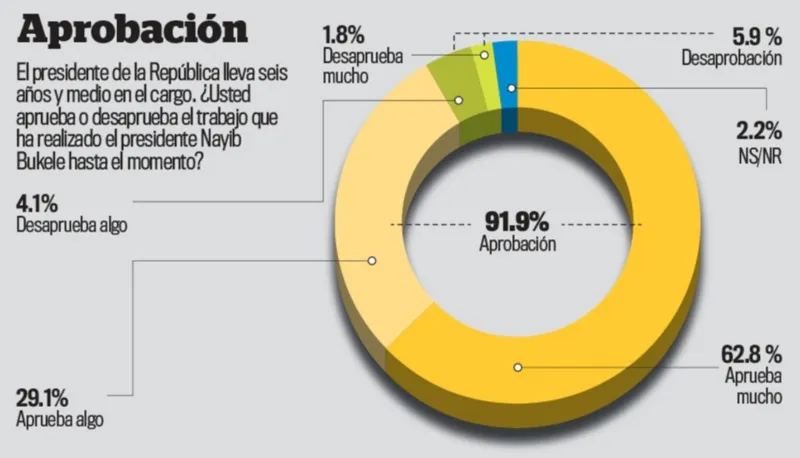 De los encuestados, el 62,8 % manifestó un respaldo alto hacia Bukele, mientras que el 29,1 % mostró aprobación moderada. Solo un 5,9 % expresó desaprobación y un 2,2 % se abstuvo de emitir opinión.